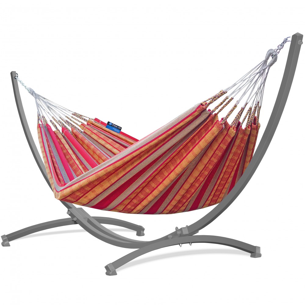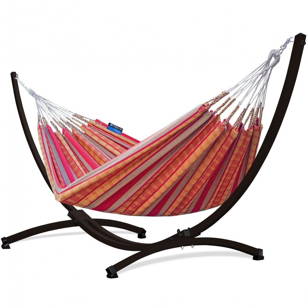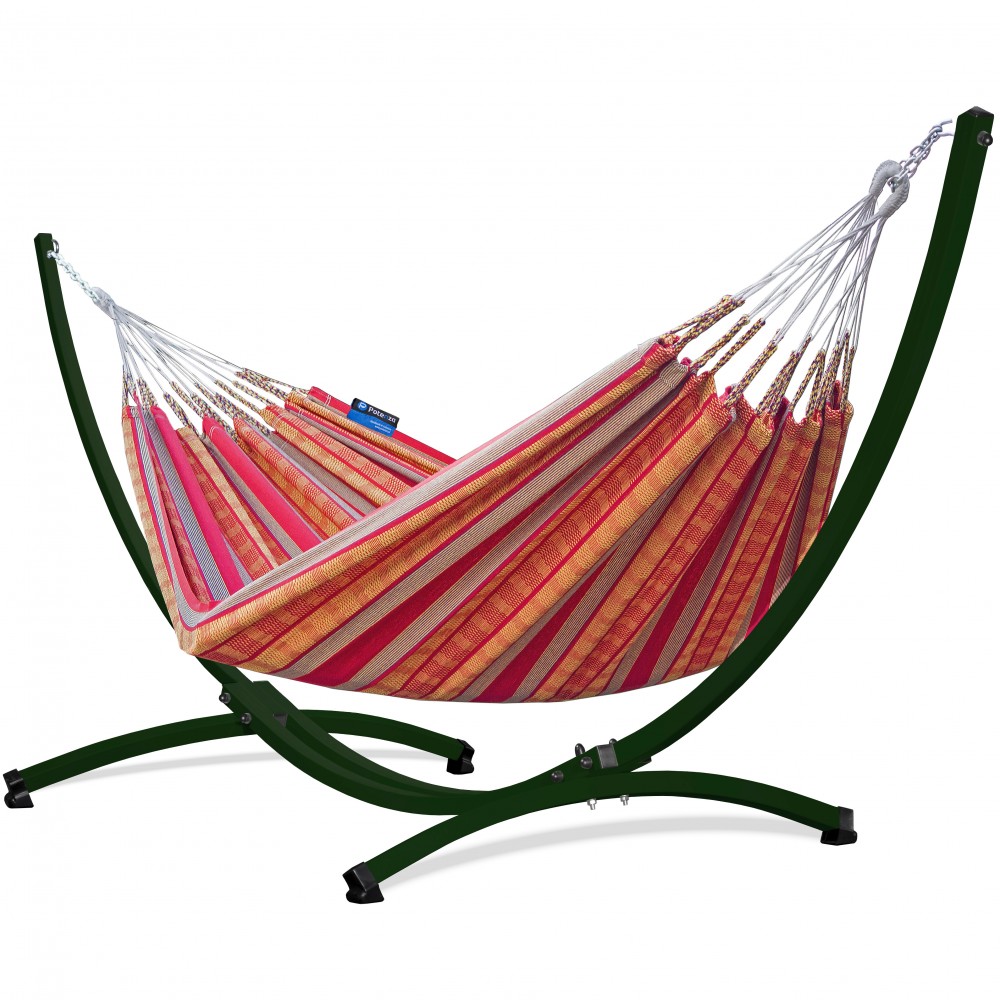 Hamac confortabil din bumbac cu suport. Ofera o odihna confortabila pentru doua persoane. In plus, culorile frumoase adauga farmec gradinii sau balconului dumneavoastra.