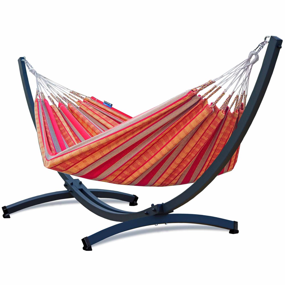 Hamac confortabil din bumbac cu cadru mare aluminiu. Cu o suprafață de întins peste medie, asigură o odihnă confortabilă pentru două persoane. Mare, stabil, bine făcut - așa poate fi descris acest produs.
