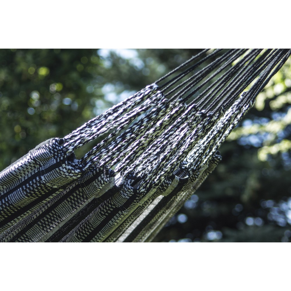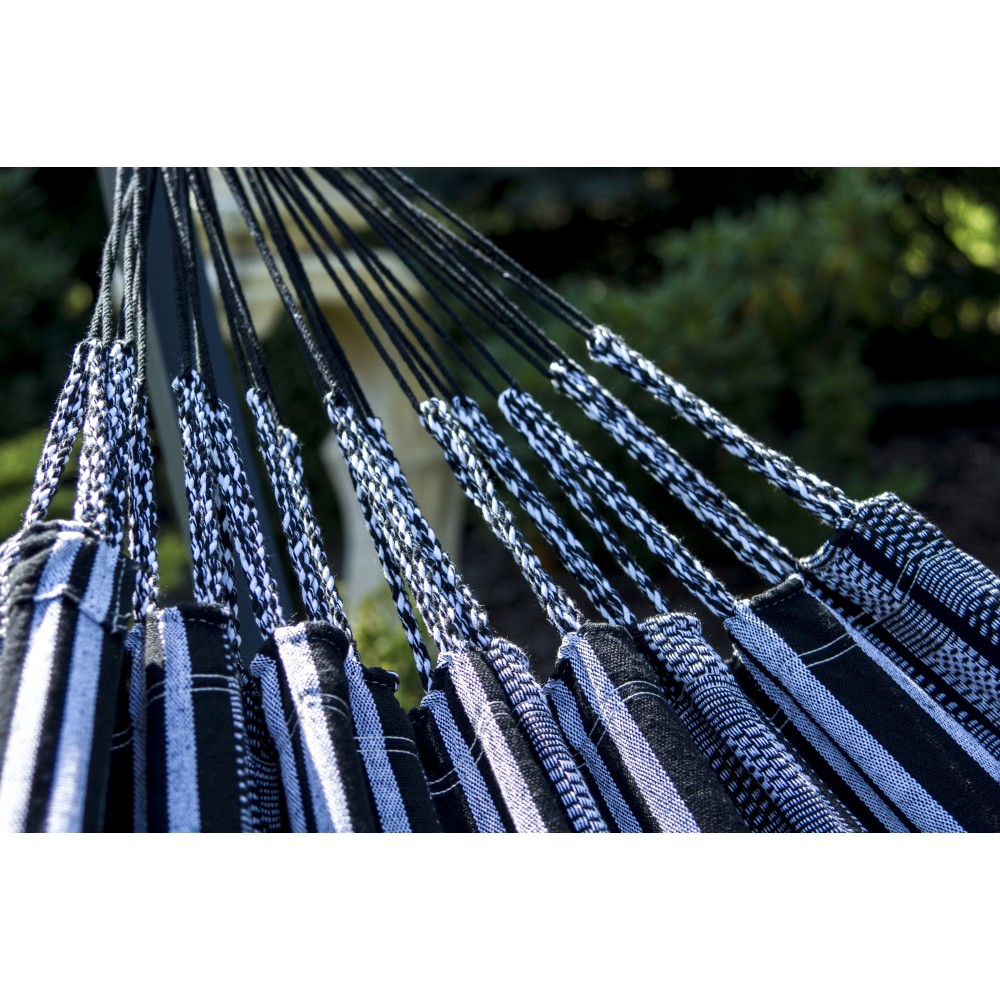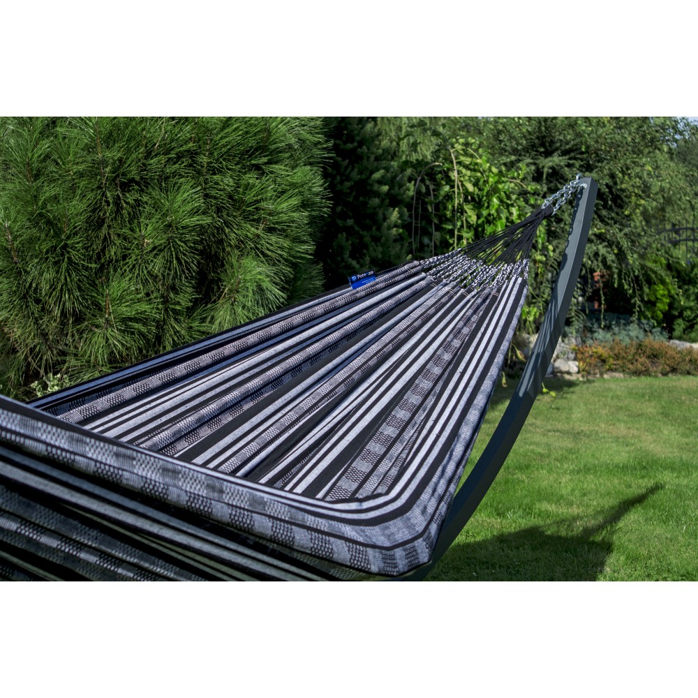 - 100% bumbac în material, ceea ce face hamacul mai respirabil, moale la atingere și ușor de întreținut. Datorită bumbacului, este asigurată o circulație adecvată a aerului.