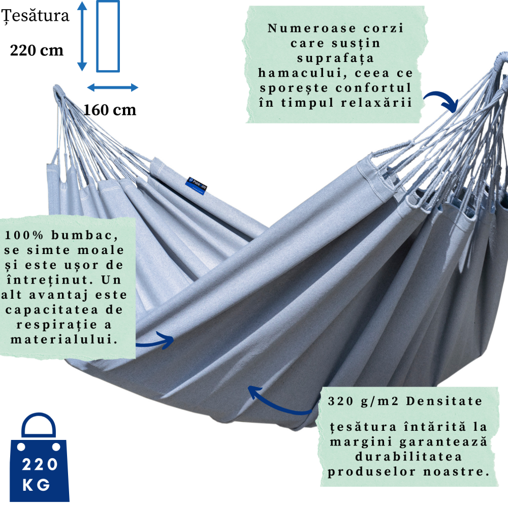 100% bumbac în material, ceea ce face hamacul mai respirabil, moale la atingere și ușor de întreținut. Datorită bumbacului, este asigurată o circulație adecvată a aerului.