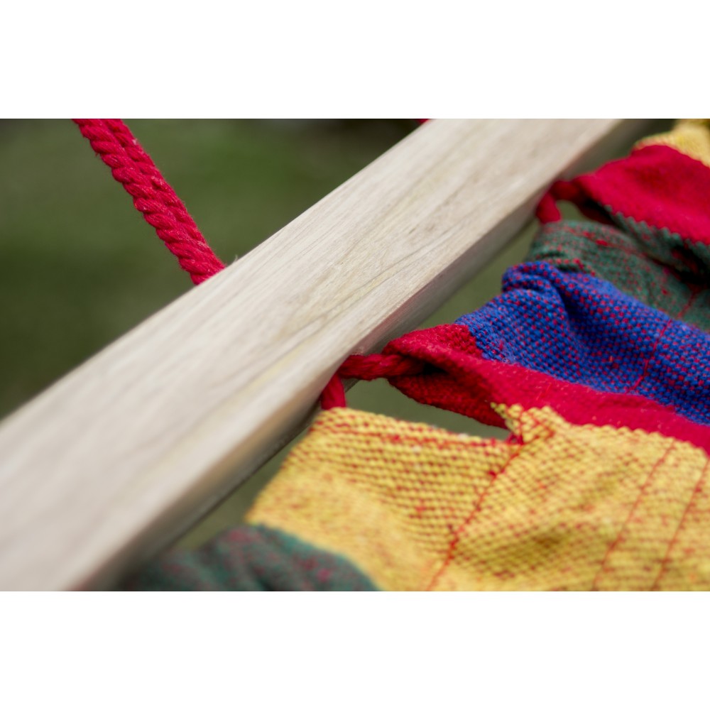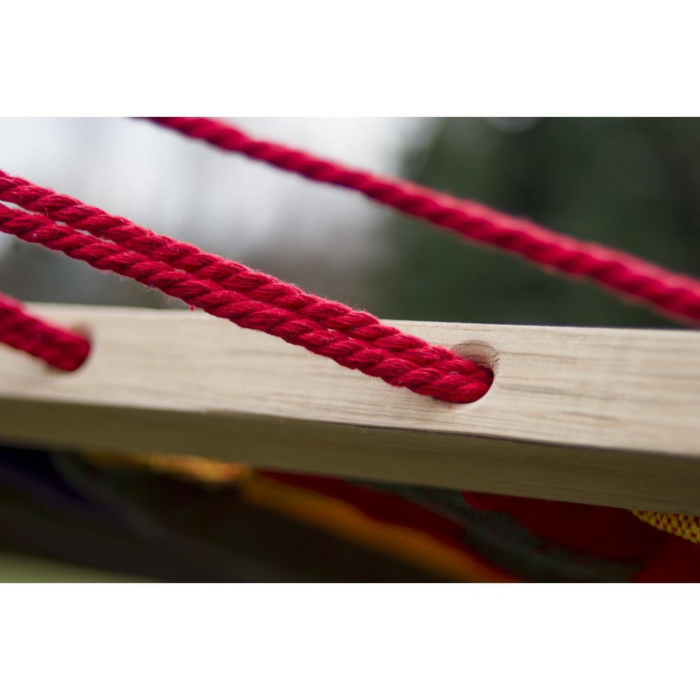 HANGING MAT este fabricat din bumbac (70%), este moale la atingere și ușor de curățat. Țesătura densă, întărită la margini, garantează durabilitatea produselor noastre. Un avantaj suplimentar sunt numeroasele corzi care susțin suprafața hamacului, ceea ce sporește confortul în timpul odihnei. Hamacul are bare transversale realizate din lemn dur, care garantează o poziție de culcare mai stabilă decât hamacele convenționale.