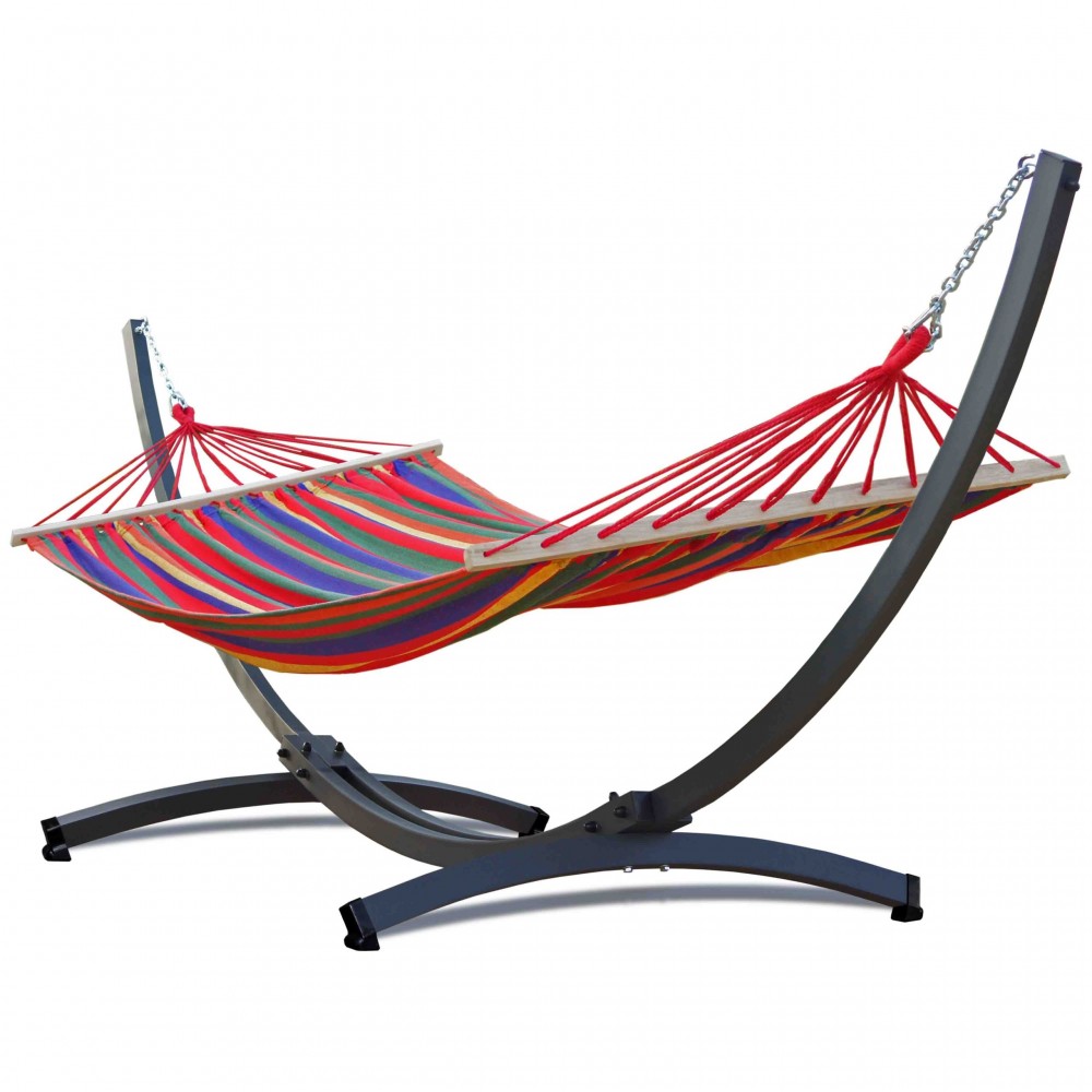 Hamac confortabil cu stâlp din bumbac cu suport. Oferă o odihnă confortabilă pentru două persoane. În plus, culorile frumoase adaugă farmec grădinii sau balconului dumneavoastră.