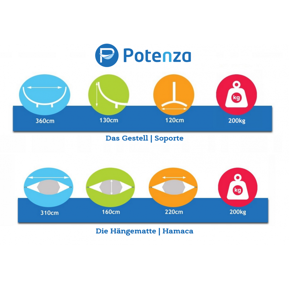 Setul conține: un cadru -> lungime: 360 cm, înălțime: 130 cm, lățime: 120 cm, capacitate de încărcare: 200 kg, profil gol 6x4cm I un hamac XXL 200kg (220x160cm), inclusiv husa de protecție, frânghii de extensie, șuruburi și instrucțiuni clare de asamblare.