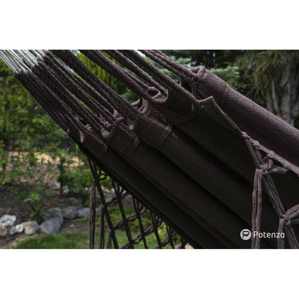 100% bumbac în material, ceea ce face hamacul mai respirabil, moale la atingere și ușor de întreținut. Datorită bumbacului, este asigurată o circulație adecvată a aerului.