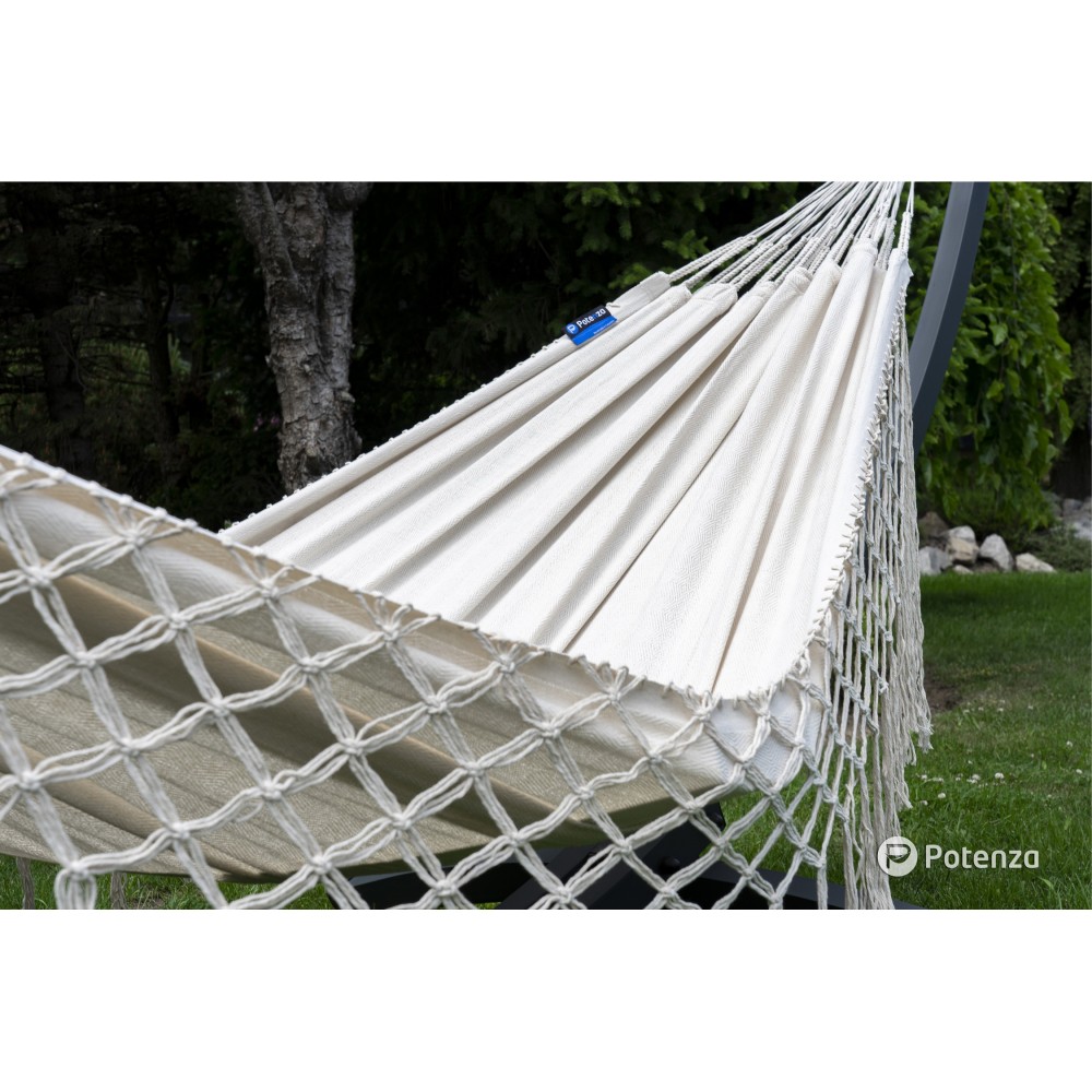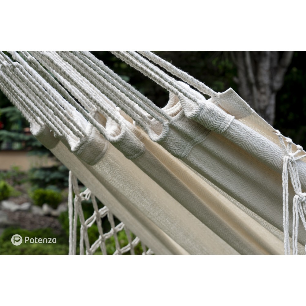 100% bumbac în material, ceea ce face hamacul mai respirabil, moale la atingere și ușor de întreținut. Datorită bumbacului, este asigurată o circulație adecvată a aerului.