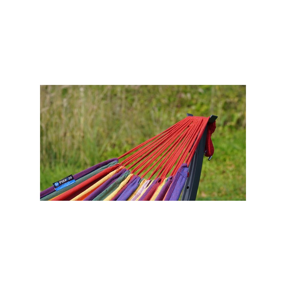 ✔️ Hamacul este fabricat din 70% bumbac, 30% poliester, este moale și ușor de curățat. Un avantaj suplimentar sunt numeroasele corzi care susțin suprafața hamacului, ceea ce sporește confortul în timpul odihnei.