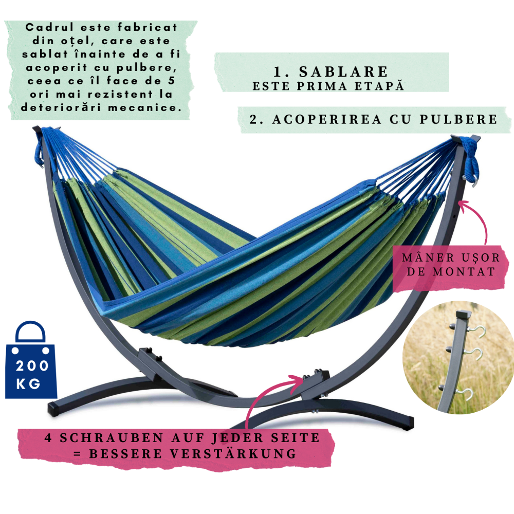 ✔️ Setul include: un cadru -> lungime: 250 cm, înălțime: 110 cm, lățime: 98 cm, capacitate de încărcare: 200 kg, I un hamac cu stâlp 120kg (200x120cm) șuruburi, precum și instrucțiuni clare de asamblare.