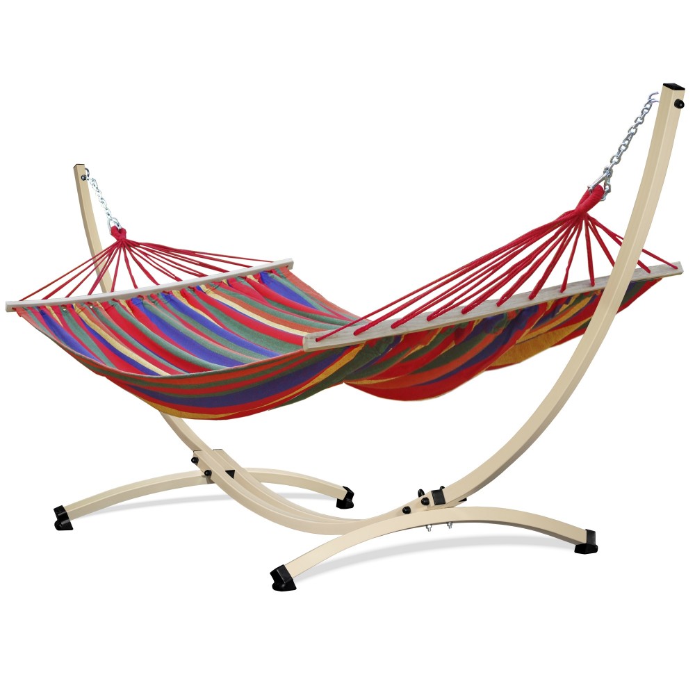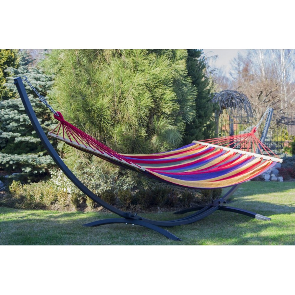 Hamac confortabil din bumbac cu suport. Ofera o odihna confortabila pentru doua persoane. In plus, culorile frumoase adauga farmec gradinii sau balconului dumneavoastra.