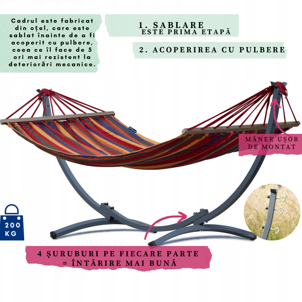 ✔️ Setul include: un cadru -> lungime: 250 cm, înălțime: 110 cm, lățime: 98 cm, capacitate de încărcare: 200 kg, I un hamac cu stâlp 120kg (200x120cm) șuruburi, precum și instrucțiuni clare de asamblare.