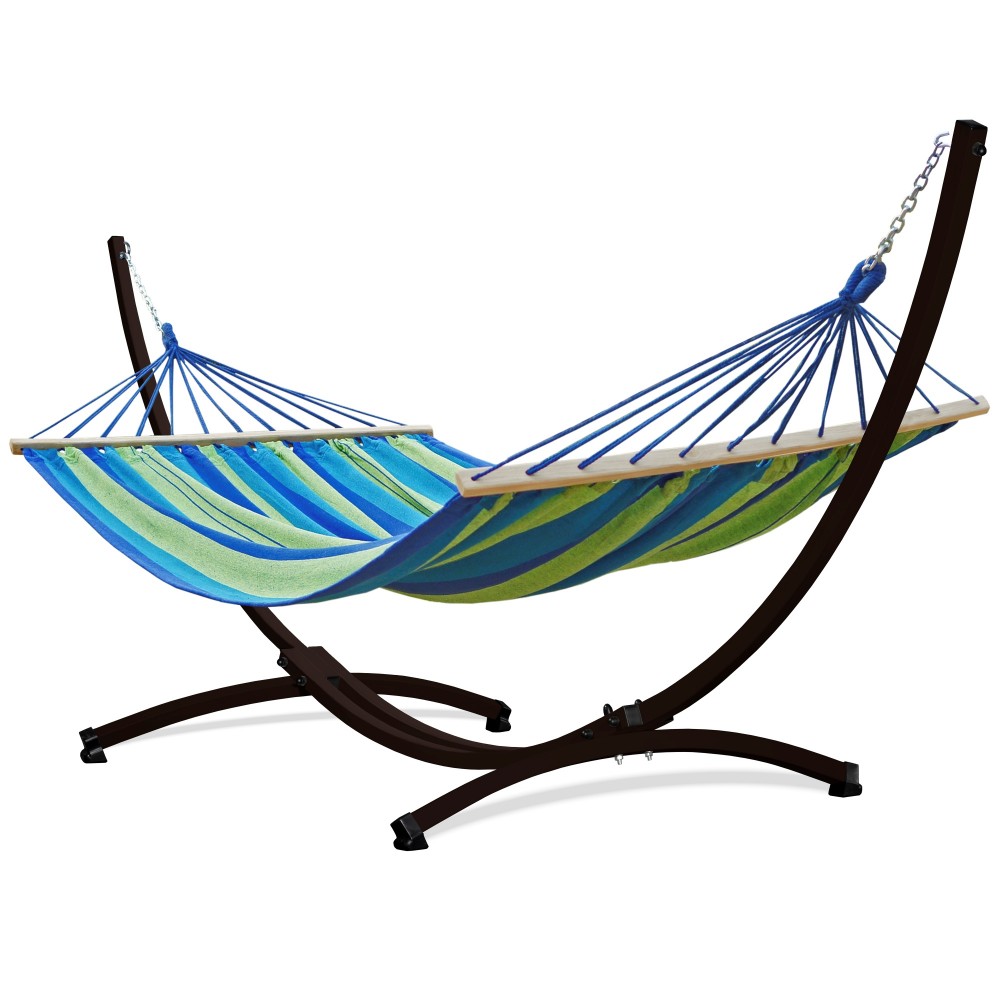 1.Hamac confortabil din bumbac cu suport. Datorita unei suprafete de intins peste medie, asigura o odihna confortabila pentru doua persoane. Mare, stabil, bine facut - asa poate fi descris acest produs.