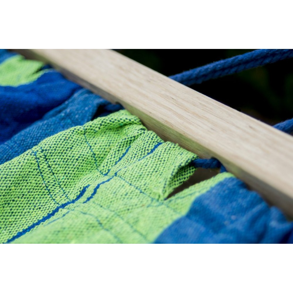 2. Hamac dublu este fabricat din 70% bumbac, se simte moale si este usor de curatat. Un avantaj suplimentar este format de numeroasele corzi care sustin suprafata hamacului, ceea ce sporeste confortul in timpul odihnei.