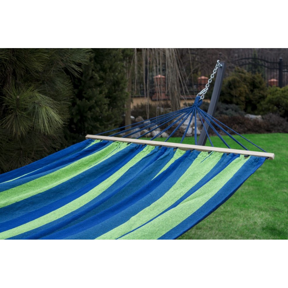 Hamac confortabil din bumbac cu suport. Ofera o odihna confortabila pentru doua persoane. In plus, culorile frumoase adauga farmec gradinii sau balconului dumneavoastra.