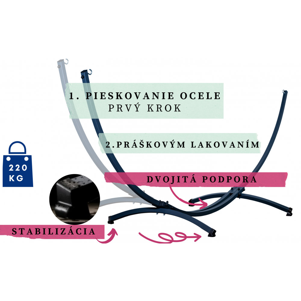- Piciorul este plasat pe picioarele profilului pentru a proteja podeaua pe care se află cadrul, pentru a crește stabilitatea în timpul utilizării hamacului și, de asemenea, pentru a proteja capetele profilului de deteriorare. Piciorul nostru este conceput pentru a oferi un suport ideal pentru cadru. Piciorul patentat și proprietar al designului nostru, are o suprafață de contact de până la 4x5 cm. Acest lucru este incomparabil mai mult decât cadrele de la alte companii, care se sprijină doar pe vârful profilului.