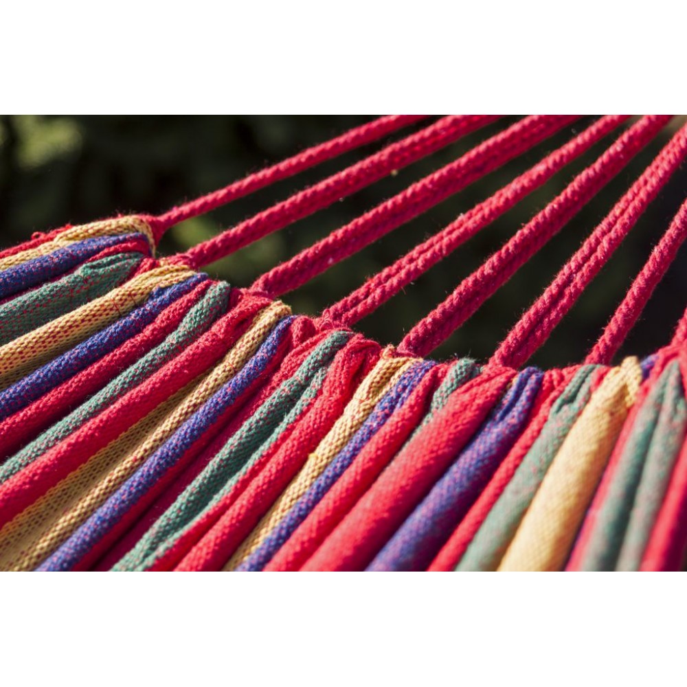 Hamac confortabil din bumbac cu suport. Oferă o odihnă confortabilă pentru două persoane. În plus, culorile frumoase adaugă farmec grădinii sau balconului dumneavoastră.