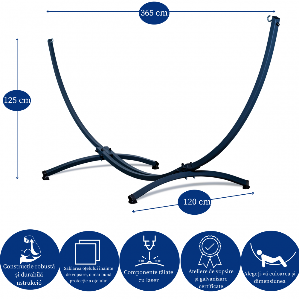 Materialul din oțel galvanizat asigură durabilitate și rezistență la intemperii. Fie că este vorba de vânt, ploaie sau soare, acest cadru de hamac vă va rămâne fidel.