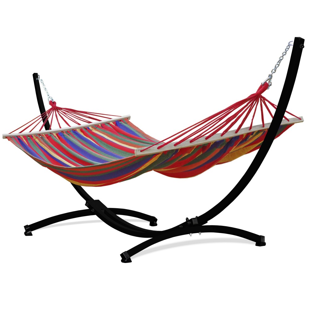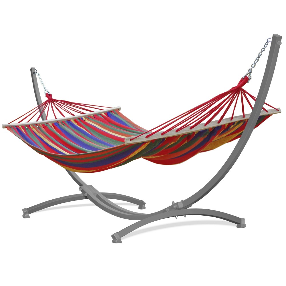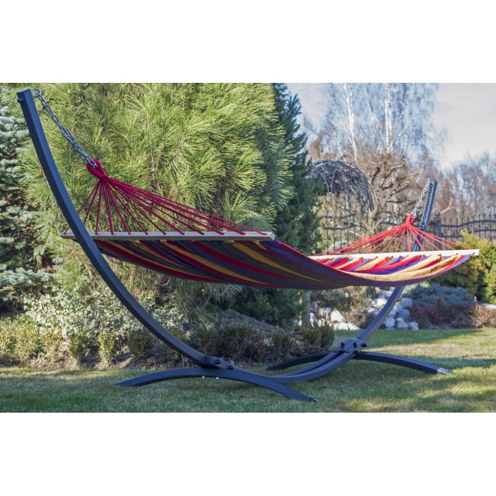 Hamac confortabil din bumbac cu suport. Ofera o odihna confortabila pentru doua persoane. In plus, culorile frumoase adauga farmec gradinii sau balconului dumneavoastra.