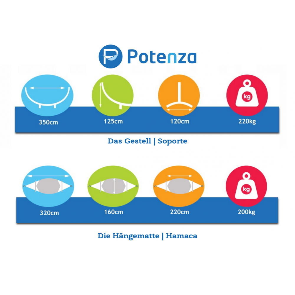 5. Setul contine: un cadru -> lungime: 350 cm, inaltime: 125 cm, latime: 120 cm, capacitate de incarcare: 220 kg, profil gol 4x4cm I un hamac XXL 200kg (220x160cm), corzi de extensie, suruburi, precum si instructiuni clare de asamblare.